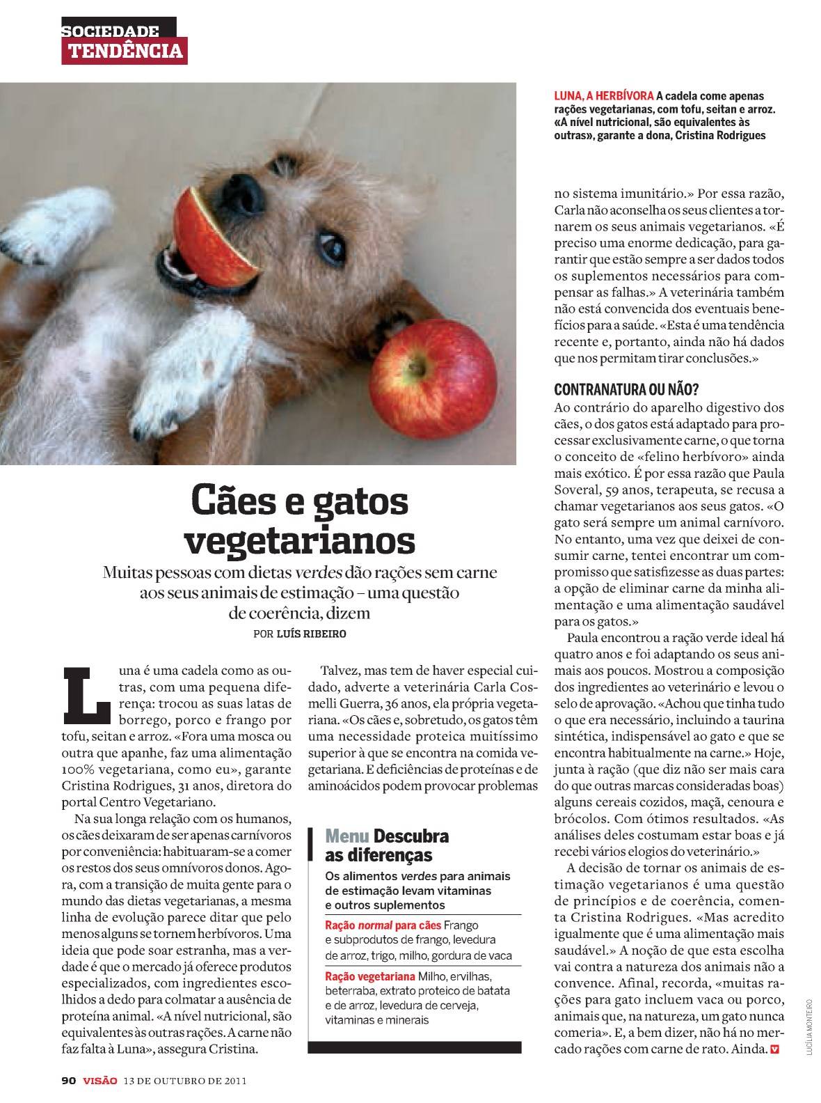 A passada edição da revista VISÃO (13-10-2011) publicava uma curta reportagem sobre indivíduos vegetarianos que decidiram incluir os seus animais de estimação no mesmo regime alimentar. O argumento por detrás de tal decisão é a coerência : todas as rações para cães e gatos de estimação são feitas a partir de produtos e sub-produtos da transformação animal e provenientes, na sua larga maioria, de explorações intensivas. Alguém que se abstém de consumir carne e derivados e vive na companhia de um cão ou de um gato (ou de um furão…), não deve ficar indiferente a este facto.