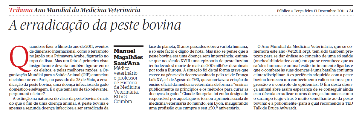Reproduzo aqui o pequeno artigo que publiquei no Jornal Público de hoje, sobre a erradicação da peste bovina e o Ano Internacional da Medicina Veterinária (clique para visualizar).