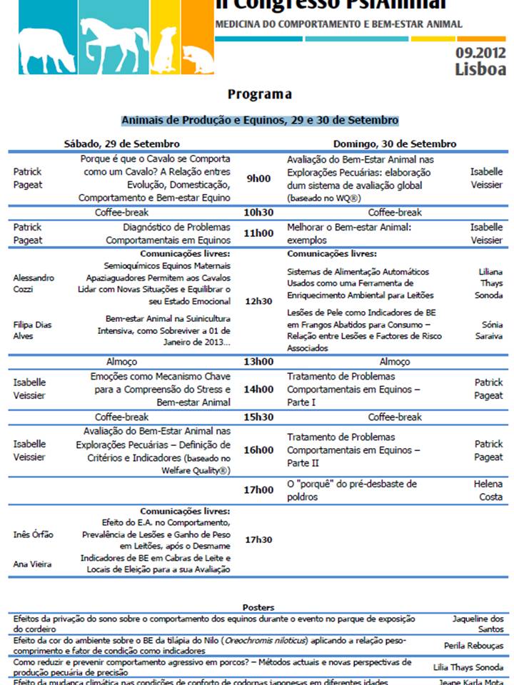 No tema Animais de Produção e Equinos, 29 e 30 de Setembro, os palestrantes convidados internacionais são os investigadores Patrick Pageat, presidente do European College of Veterinary Behavioural Medicine – Companion Animals e Isabelle Veissier, membro da comissão organizadora do projeto Welfare-Quality e do WelfareQuality Network.