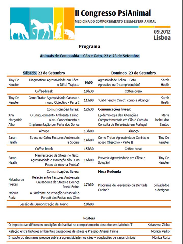 No tema Animais de Companhia – Cão e Gato, 22 e 23 de Setembro, as palestrantes convidadas internacionais são as médicas veterinárias especialistas em medicina de comportamento de animais de companhia Sarah Heath e Tiny de Keuster.