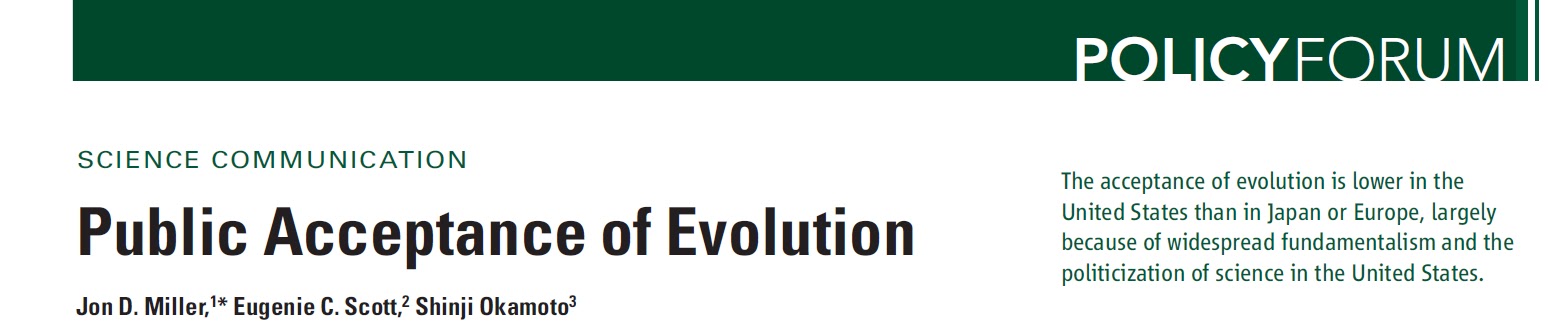 Este artigo fora publicado em 2006 na Science, por Jon D. Miller, Eugenie C. Scott e Shinji Okamoto, respectivamente dois investigadores dos Estados Unidos e um do Japão. Como acontece frequentemente em artigos publicados nestas revistas de elevado factor de impacto e que são extremamente condensados, para aferir como o estudo foi de facto conduzido o que precisamos de ler é o material de suporte disponível online.