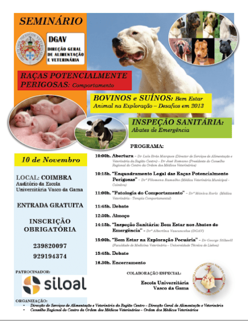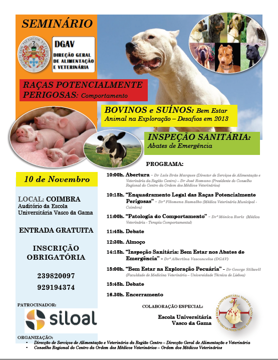 O Conselho Regional do Centro da Ordem dos Médicos Veterinários, em parceria com a Direcção de Serviços de Alimentação e Veterinária da Região Centro – DGAV e com a colaboração da Escola Universitária Vasco da Gama, está a organizar um Seminário referente aos temas: