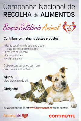 A associação Animalife promove até dia 19 de Maio uma campanha de recolha de rações e outros produtos para animais de companhia nas cadeias de supermercados Continente para o Banco Solidário Animal, que apoia cerca de 60 instituições de apoio a estes animais por todo o país.