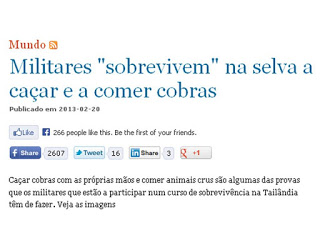Na sequência da notícia publicada pelo Jornal de Notícias, divulgada também pela TVI a 20 de Fevereiro de 2013 (também com destaque na imprensa internacional), foi possível visualizar um conjunto de imagens do exercício militar Cobra Gold. Este evento, promovido na Tailândia pelo seu exército em parceria com forças militares dos EUA, decorre anualmente desde 1980 e visa fortalecer as relações militares entre os EUA e a região da Ásia-Pacífico. Na presente edição (11 a 21 de Fevereiro) participaram ainda Japão, Coreia do Sul, Malásia, Indonésia e Singapura. Foram 13 mil os operacionais que se submeterem ao curso de sobrevivência levado a cabo na base tailandesa de Sattahip, província de Chonburi, na qual, entre outros exercícios, foi ensinada a caça e a alimentação a cru de cobras, insetos e aves. Olhando aos títulos das notícias, e às respetivas imagens, somos confrontados com “mensagens” díspares. Se, por um lado, as cobras são referidas como recurso para a “sobrevivência”, por outro, as imagens dizem-nos algo mais. Observamos o maneio das cobras ainda vivas e, já depois de mortas, podemos ver o seu sangue bebido e escorrido pela cara e farda dos militares. Muitos apresentam ainda máquinas em punho a registar o momento e, por último, a atenção prende-se com a fotografia de um participante exibindo partes de uma cobra a penetrar as suas narinas.