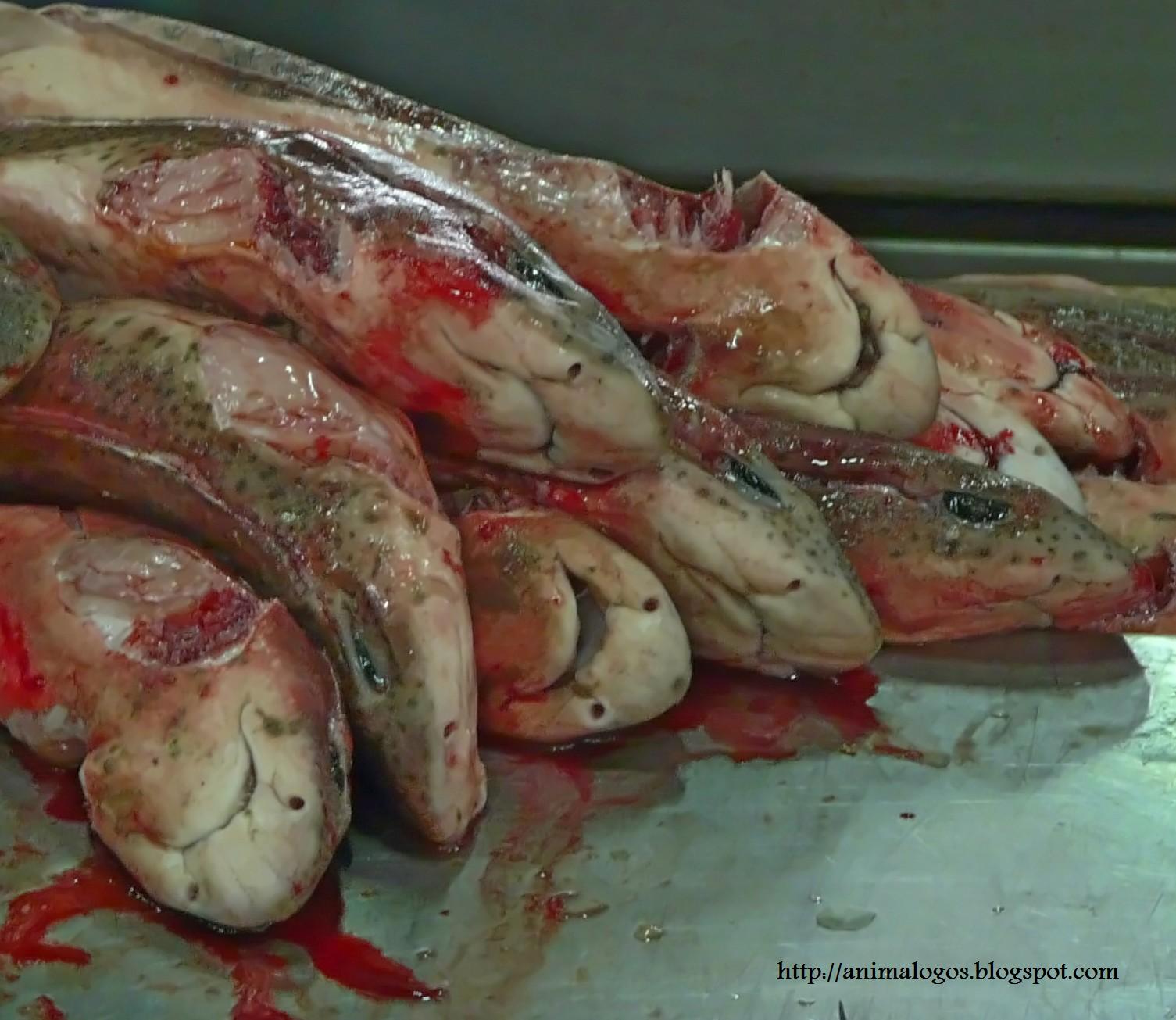 Exemplares de uma espécie de tubarão (pinta-roxa) à venda no mercado de Olhão.(Repare na ausência de barbatanas)