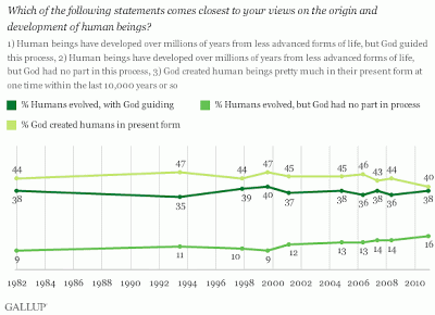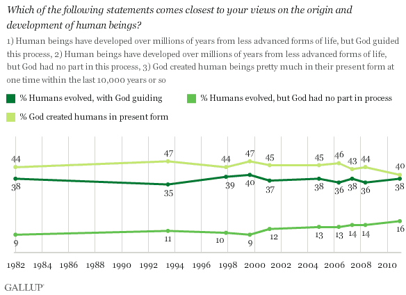 Ainda hoje, apenas 16% dos Americanos acreditam na evolução sem intervenção divina. (Fonte: GALLUP)