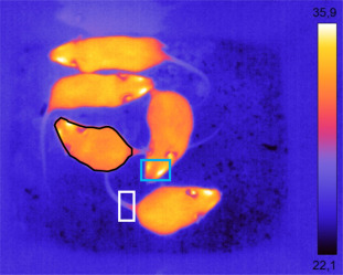 Já tínhamos descoberto (Gjendal et al 2018) que a temperatura média do corpo era um indicador mais robusto que a temperatura dos olhos ou cauda. Desenvolvemos então com colegas do i3S (Franco, Gerós et al 2019) software capaz de detectar automaticamente os termogramas dos murganhos e calcular a média de milhares de imagens automaticamente.