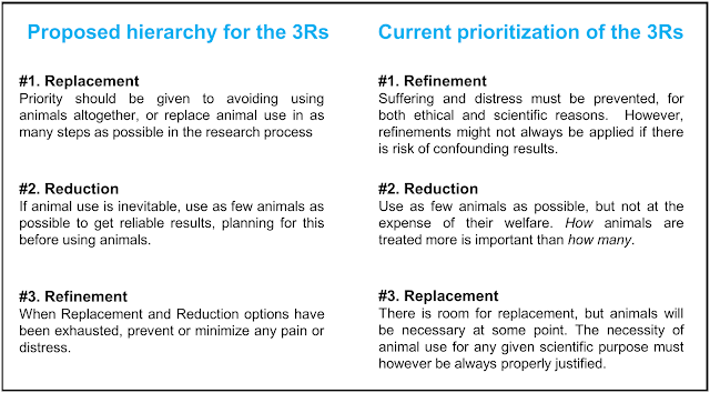 Todos os dados que recolhemos apontam para uma “inversão” da hierarquia de prioridades, relativamente à originalmente proposta nos anos 1950s pelos arquitectos dos 3Rs, William Russell e Rex Burch. Ao passo que estes priorizavam a substituição do uso de animais, e apenas quando esgotada essa possibilidade propunham que se considerasse a redução e refinamento, os investigadores actualmente priorizam o Refinamento sobre a Redução e esta sobre a Substituição.