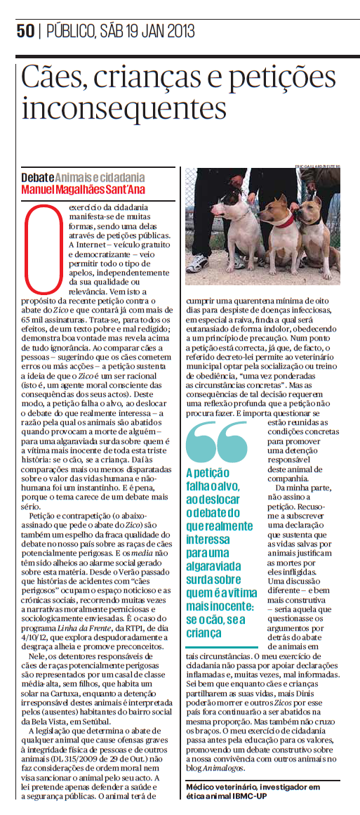 Foi com entusiasmo que soube da criação, no passado dia 18 de Junho, da Provedoria dos Animais da Câmara Municipal de Lisboa. Esta medida vem acompanhada da mudança de designação do Canil/Gatil de Lisboa para Casa dos Animais (com uma nova estrutura orgânica) e da criação do Grupo de Trabalho para a Casa dos Animais, que integra a recém-empossada provedora Marta Rebelo, o Director Municipal de Ambiente Urbano da autarquia, Ângelo Mesquita e a Bastonária da Ordem dos Médicos Veterinários, Laurentina Pedroso (que preside ao grupo).