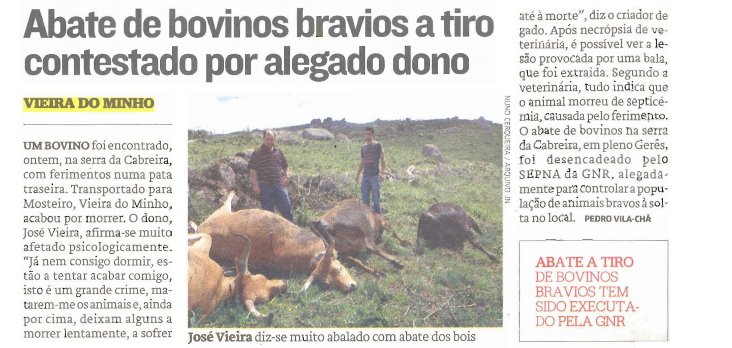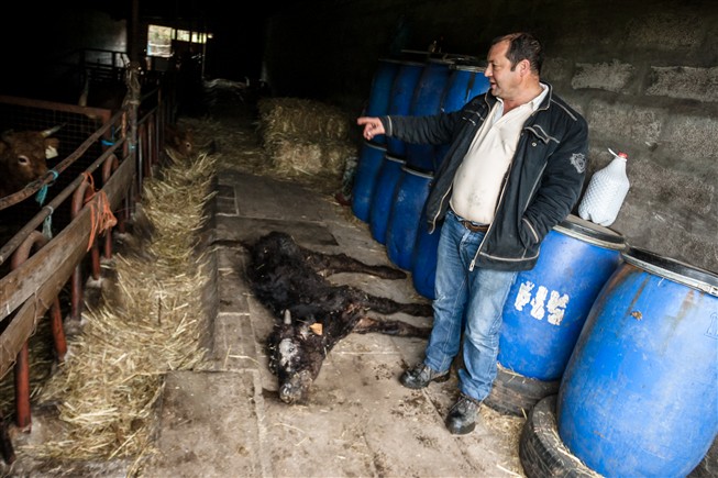 | O produtor junto a um animal em cadavérico, prestes a morrer. (Fonte:Jornal de Notícias) |