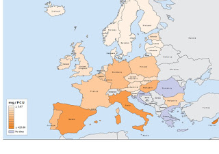 | O mapa mostra a venda de antibioticos para animais usado na produção de alimentos na União Europeia (dados de 2013, fonte European Surveillance of Veterinary Antimicrobial Consumption (ESVAC) |